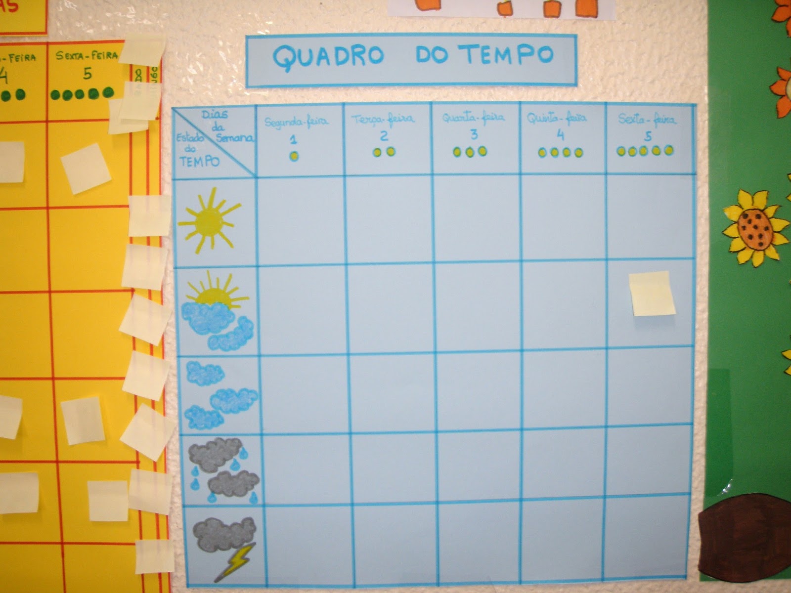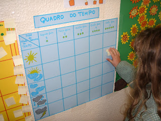 Olá amigos! Hoje, começamos a marcar o "estado do tempo" no novo quadro de dupla entrada que temos na nossa sala.
