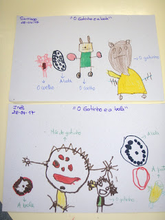 Olá amigos! Hoje trabalhámos o livro que requisitámos na biblioteca andarilha intitulado "O Gatinho e a Bola". Deixamos aqui os desenhos que fizemos para ilustrar a história.