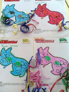 Olá amigos! É verdade, estamos quase no Carnaval e, como não podia deixar de ser, estamos a fazer estas máscaras para nos divertirmos nos próximos dias....também estamos a pintar motivos alusivos à quadra carnavalesca e já decorámos a sala com serpentinas.