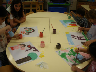 Olá amigos! Hoje misturámos cores das quais resultaram outras....cor de laranja, cor de rosa, violeta, castanho, azul claro, verde claro....Deixamos aqui o resultado: As nossas pinturas!