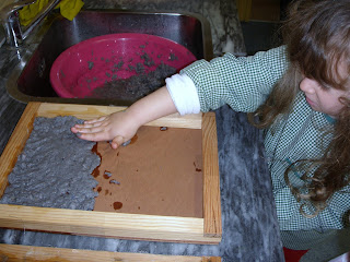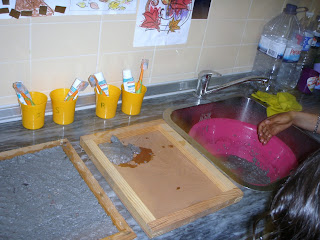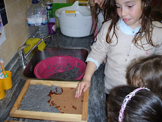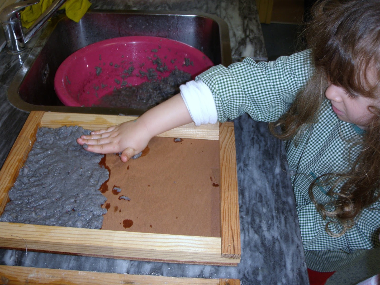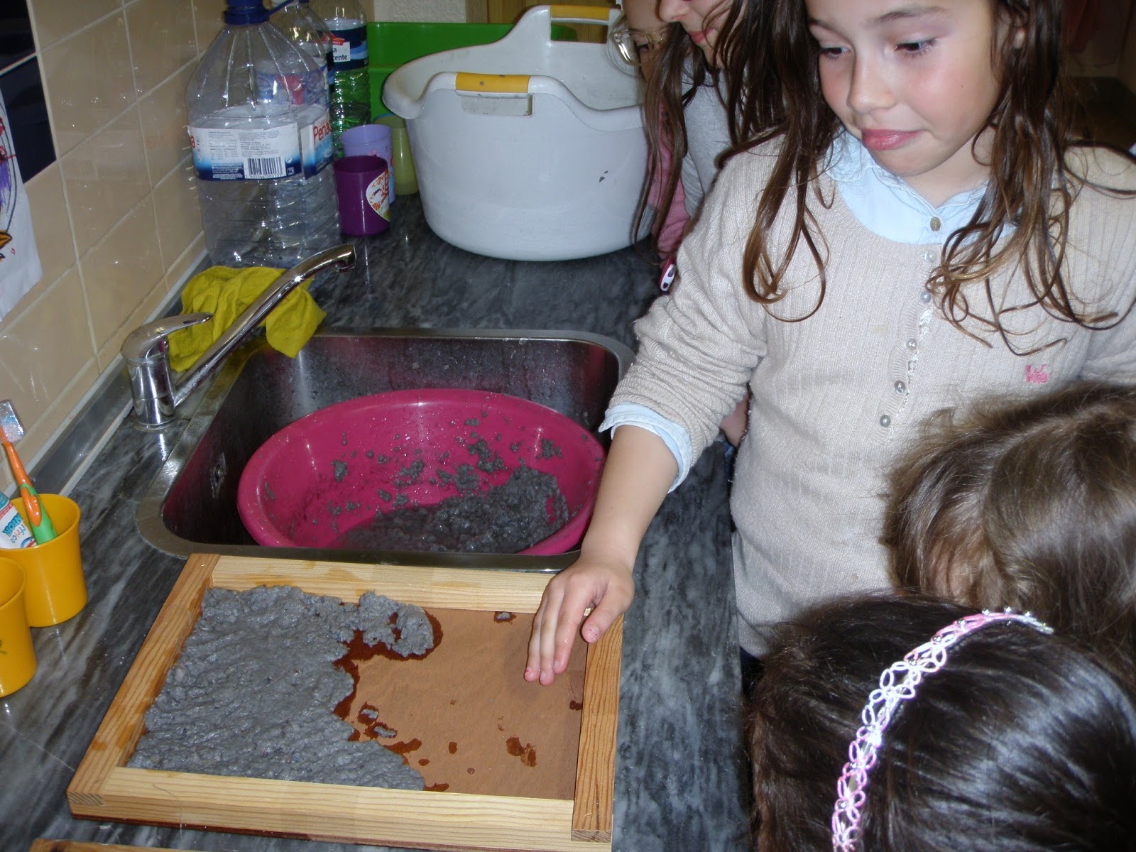 Olá amigos! Passámos à fase seguinte da reciclagem de papel. Dissolvemos o papel de jornal embebido em água, com a varinha mágica, para depois colocarmos a pasta resultante em moldes de madeira específicos. Convidámos ainda os nossos colegas da escola do 1º ciclo para participar nesta atividade.